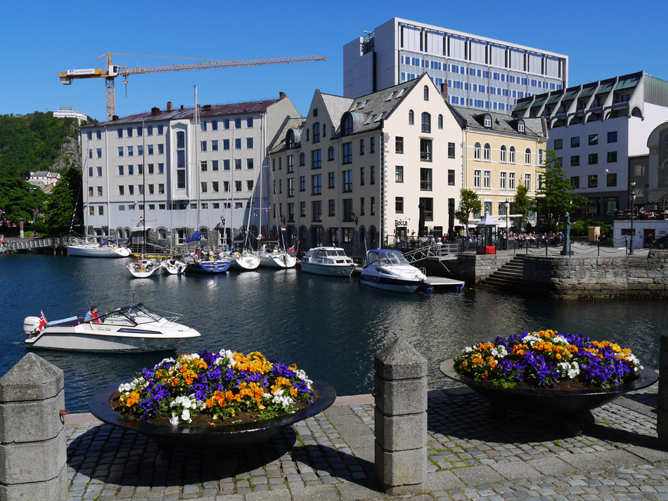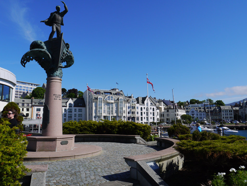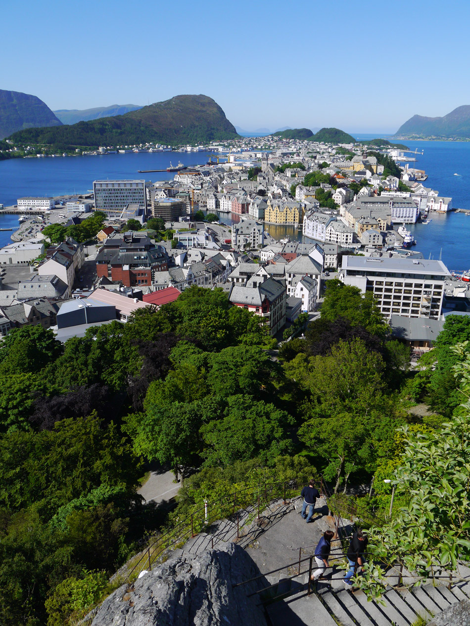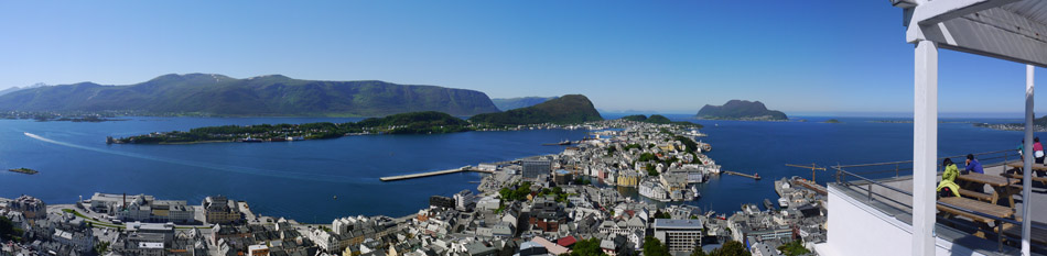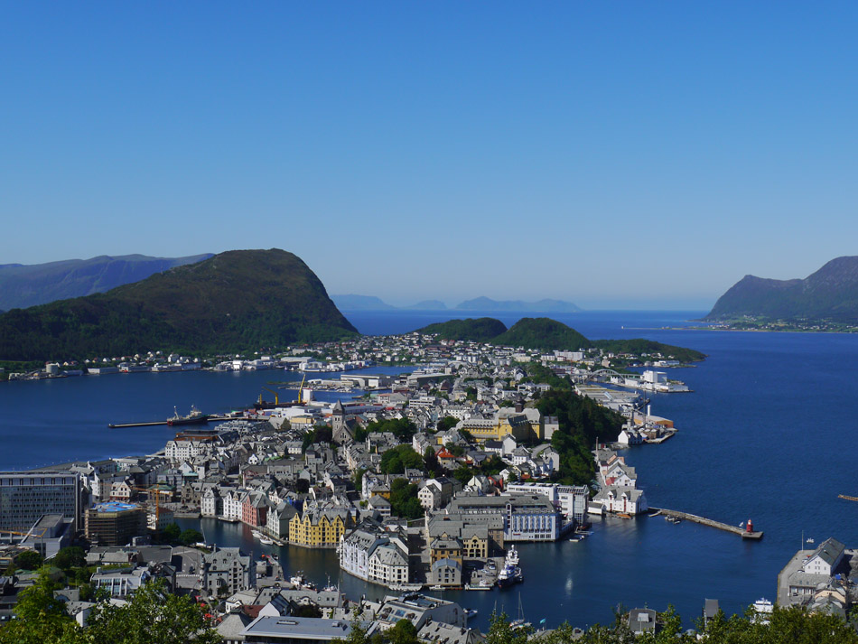Ålesund ligt op drie eilanden – Nørvøy (voorgrond), Aspøy (midden) en Hessa, op de achtergrond. Het stadscentrum ligt op de eerste twee eilanden. Dit stadscentrum werd in 1904 vrijwel geheel verwoest. Ongeveer 850 huizen brandden af, maar er viel slechts één dode.