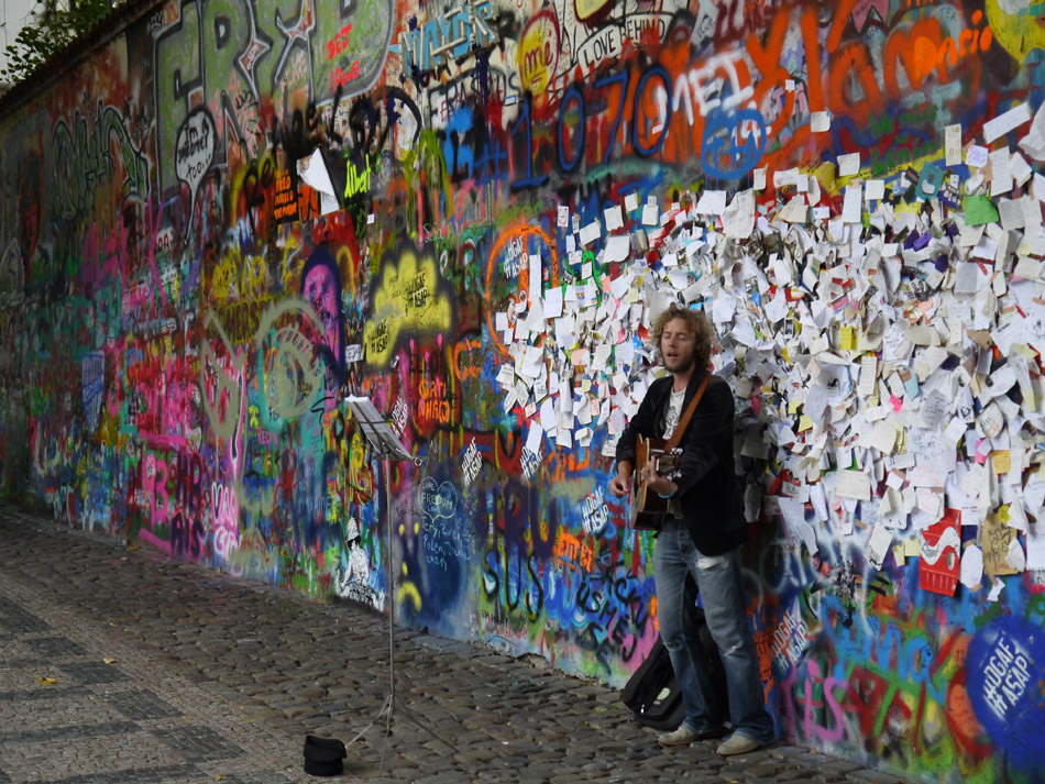 Een straatartiest treedt op bij de John Lennon-muur, dat na de communistische tijd het Praagse symbool voor vrede en liefde is geworden.