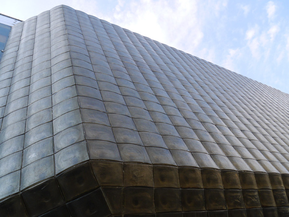 De voor geluid geïsoleerde buitenzijde van sovjettheater Nova Scena.