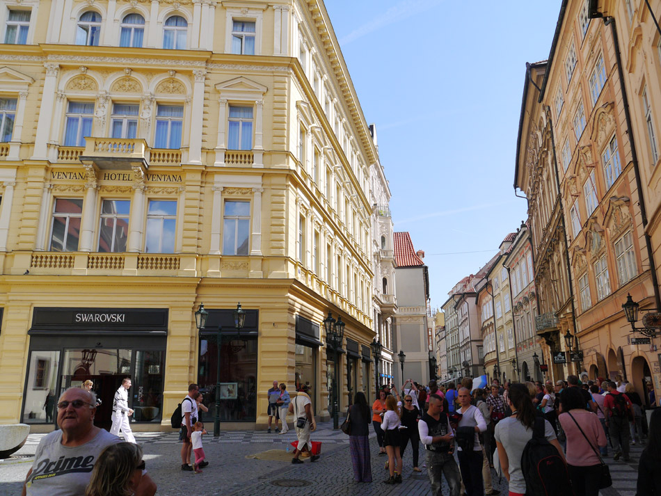 Drukte in de mooie winkelstraten van Praag.