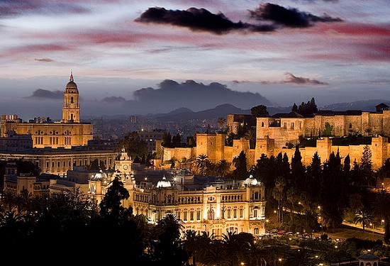 De zon gaat onder in Málaga, boven Ajuntamiento, Alcázaba en Gibralfaro, via Vittorio Sciosia