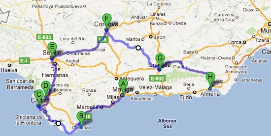(A) Málaga, (B) Gibraltar, (C) Cádiz, (D) Jerez, (E) Sevilla, (F) Córdoba, (G) Granada, (H) Almeria