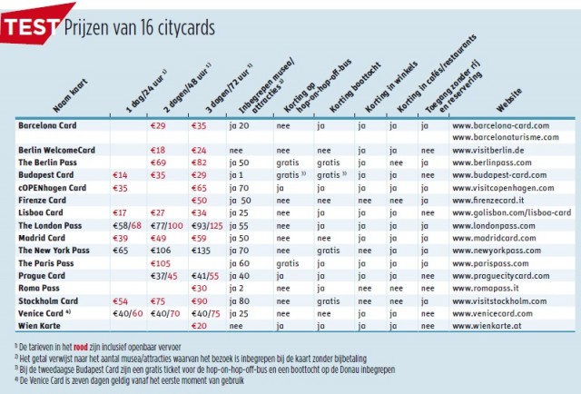 Een goede prijs-kwaliteitverhouding bieden onder meer de Lisboa Card, de Firenze Card en de cOPENhagen Card met zowel openbaar vervoer als entree tot een flink aantal musea en aardig wat extra’s. De Berlin Pass, London Pass, Paris Pass en New York Pass bieden het compleetste pakket, maar daar hangt dan ook een flink prijskaartje aan.