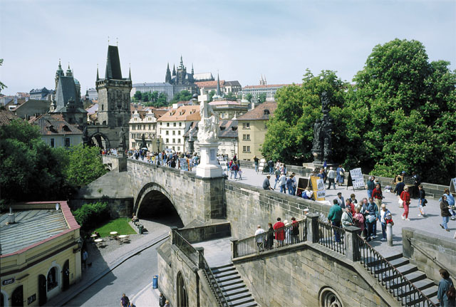 De Karelsbrug, met aan de linkerzijde de Petřínheuvel en -toren