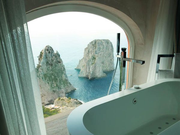 De badkamer is al mooi, maar het uitzicht… Schitterend! Via Hotel Tragara
