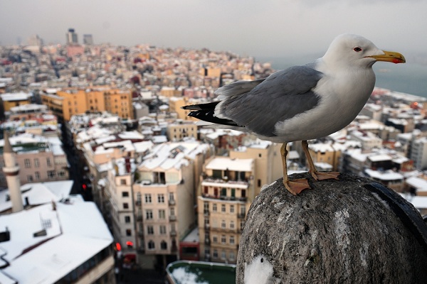 De afgelopen weken sloeg de winter niet alleen in Noord-Europa toe, maar ook in grote delen van Zuid-Europa. Zo is het de koudste februari sinds jaren in Athene en liep het Colosseum in Rome grote schade op door sneeuwval. Ook in de Turkse hoofdstad Istanbul kleurden de daken wit, waardoor deze meeuw van een ongebruikelijk uitzicht kan genieten. Foto via The Big Picture.