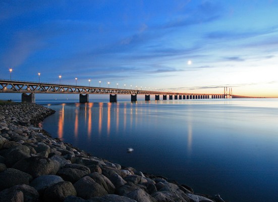 Tussen de Deense hoofdstad Kopenhagen en het Zweedse Malmö ligt de acht kilometer lange Öresundsbron (of Sontbrug). Kristian Hedberg maakte deze foto vanaf de Zweedse zijde van de brug, waarbij de avondzon nog boven Denemarken lijkt te hangen.