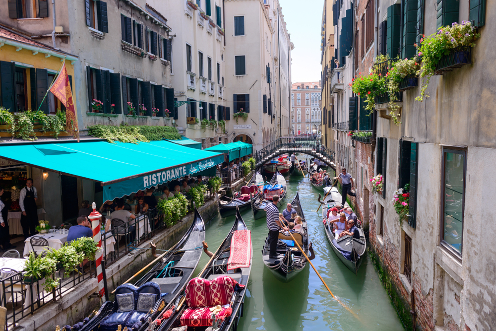 In Venetië kun je kennismaken met waterfiles. Vooral in de zomermaanden liggen de gondels netjes op elkaar te wachten, totdat ze weer een stuk je verder kunnen varen.