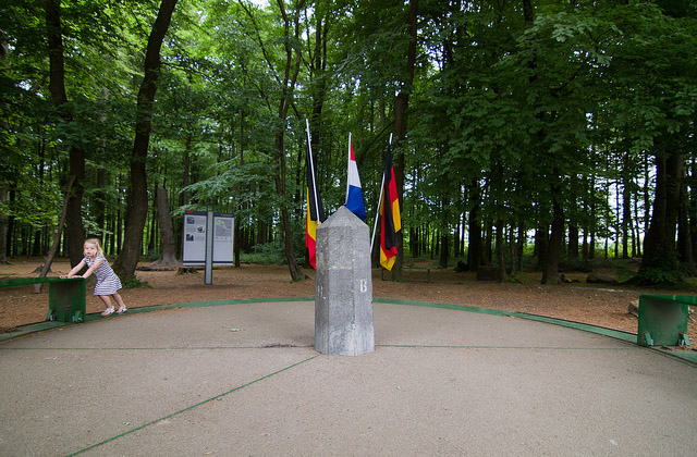 Het Drielandenpunt: een zeshoekig paaltje met drie vlaggen. Via Joris Leermakers