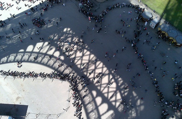 De rij bij de Eiffeltoren is soms nog langer dan de toren zelf. Via Mark Hillary