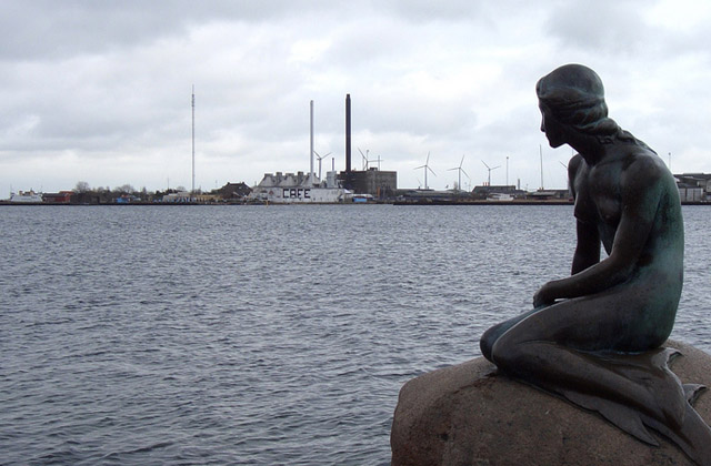 De Kleine Zeemeermin kijkt uit over het havengebied van Kopenhagen. Via Chris