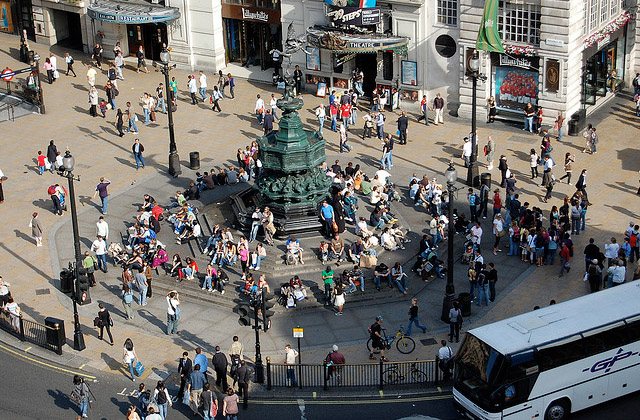 Toeristen en locals rondom de fontein op Piccadilly Circus. Via Andrew