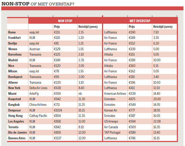Wat de prijzen betreft: bij de door ons gepeilde vluchten naar tien Europese steden lijkt vliegen met een overstap maar twee keer goedkoper. Een vlucht naar Athene was vergeleken met Transavia €24 goedkoper bij Air France via Parijs en naar Wenen bespaar je €20 als je een vlucht met overstap boekt bij Lufthansa. Op zich is dit niet zo verwonderlijk, want de luchtvaartmaatschappijen berekenen op bijna alle enkele vluchten diverse toeslagen. Heen en terug overstappen betekent vier losse vluchten en dus ook vier keer een toeslag. Heel anders gaat het eraan toe bij verre bestemmingen. Dan is overstappen wél lonend. Tegen de verwachting in zagen we geen goedkopere tickets voor non-stopvluchten. Wereldwijd waren vluchten met overstap steevast goedkoper. Het voordeel liep uiteen van €120 voor een ticket met American Airlines naar Miami, tot €351 voor een vlucht naar Buenos Aires. Gemiddeld gezien was de besparing met een overstap €241,70.