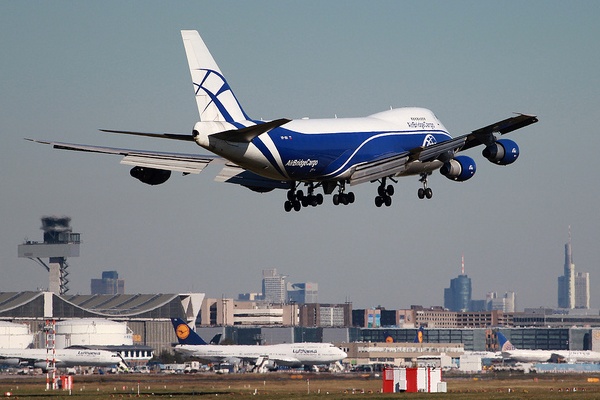 Een vrachtvliegtuig landt met de skyline op de achtergrond, via Ubiodo